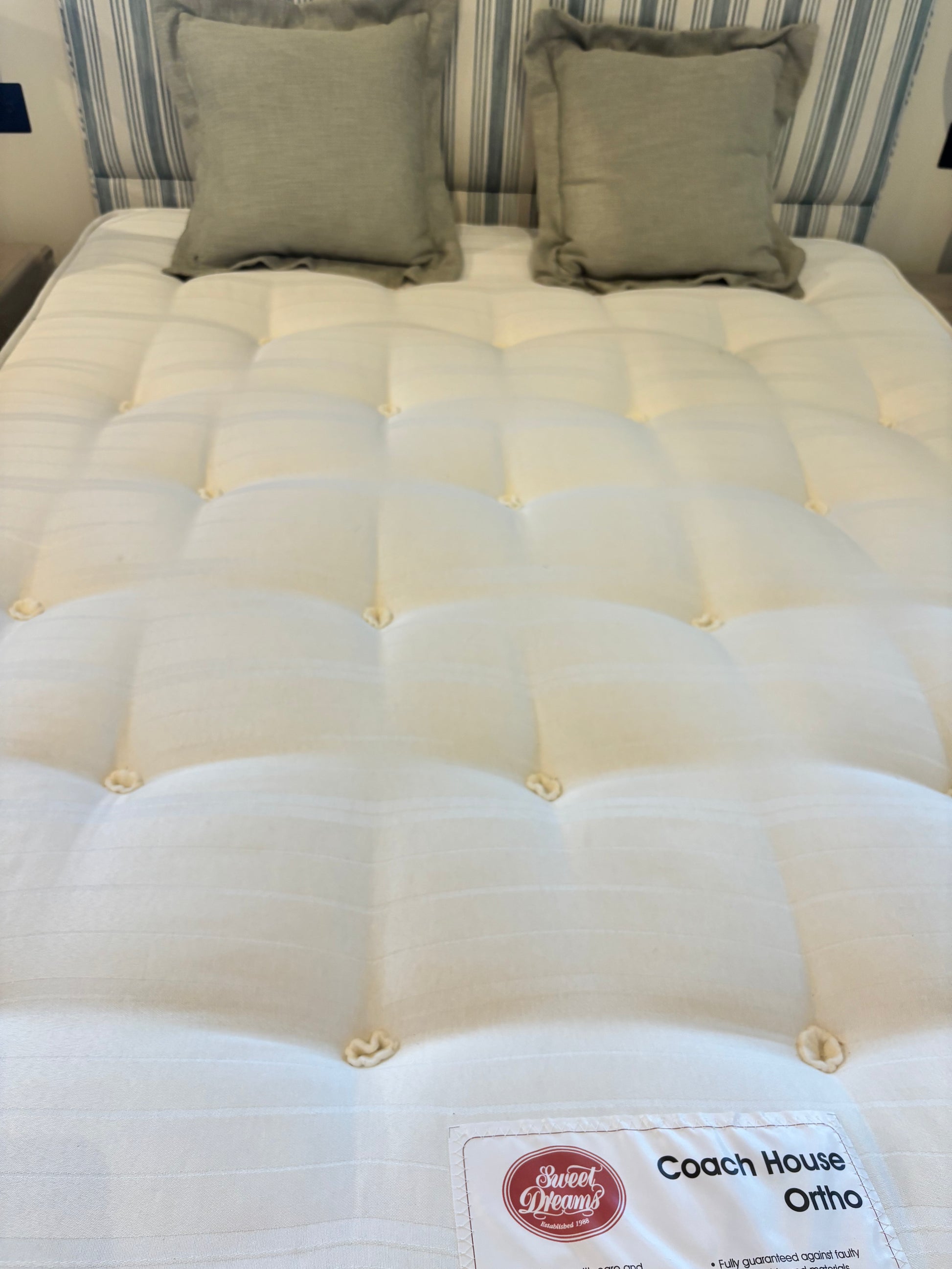 Bespoke Kingsize Bed with Blue and Cream Stripe Upholstered Headboard matching Valence and drawers each side. Coach House Orthopedic Mattrress