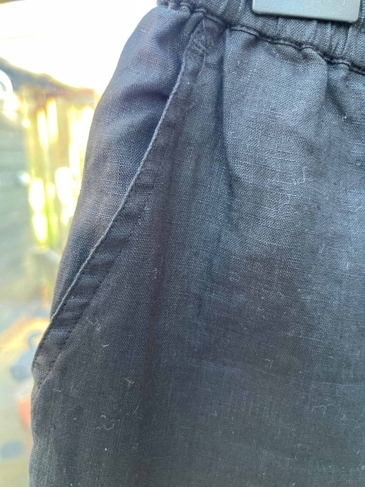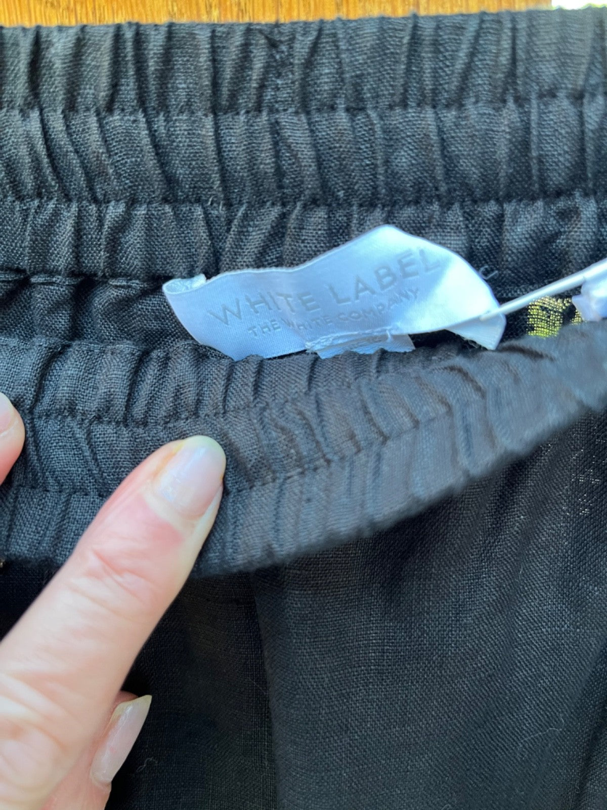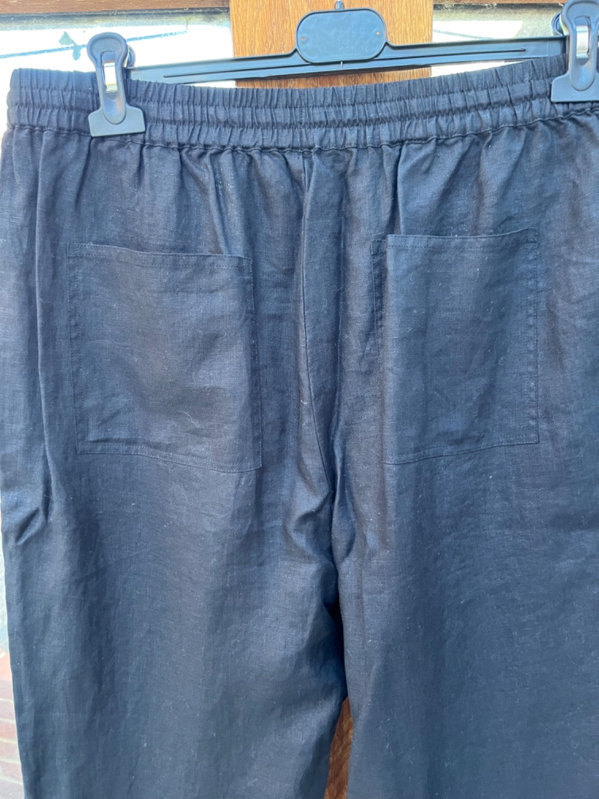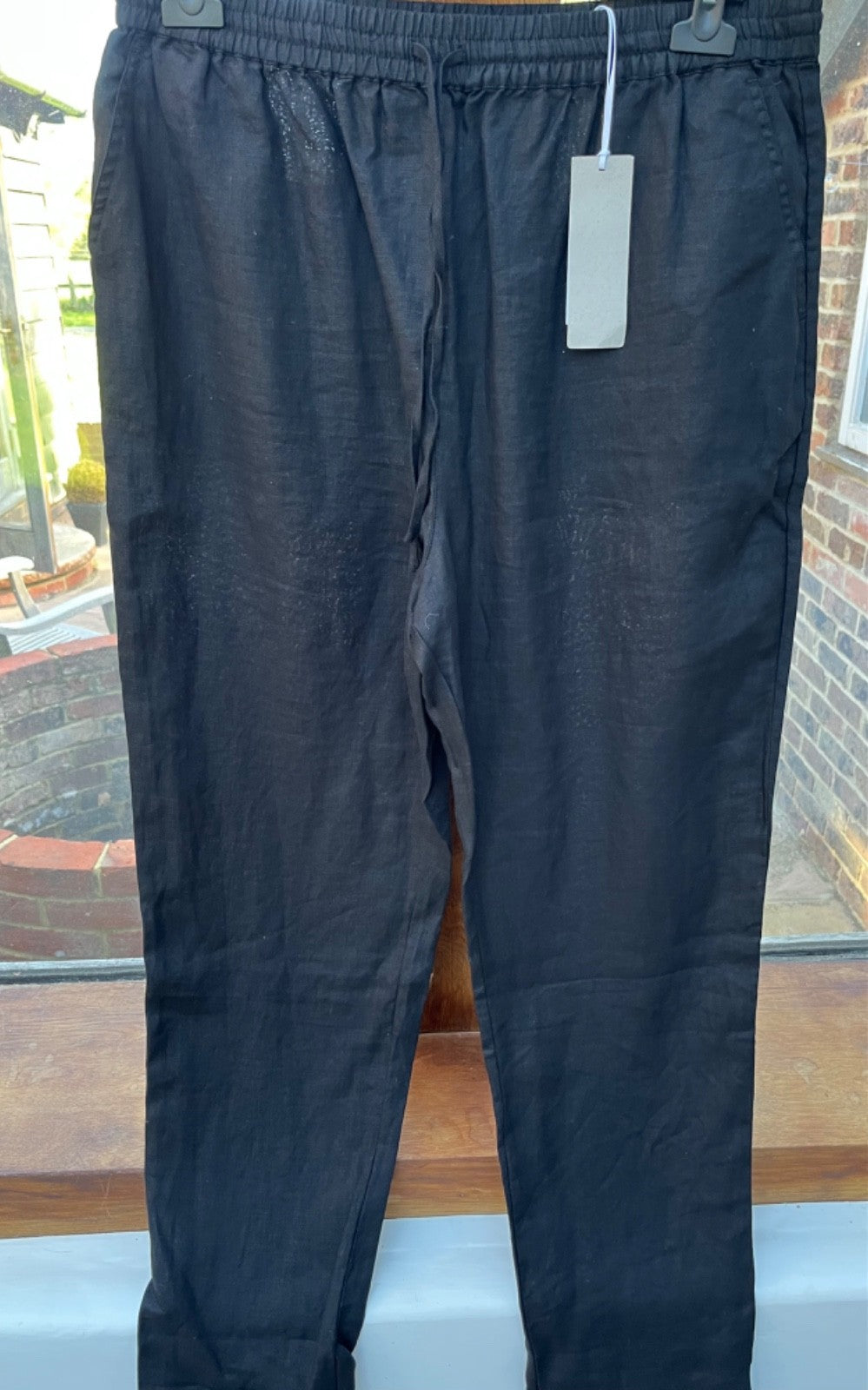 The White Company Black Linen Tapered Trousers in size 16 are a stylish addition to any woman's wardrobe. Made from high-quality linen, these trousers are perfect for casual occasions during the summer season. The tapered leg style and elasticated drawstring waist add a modern touch to the classic black colour, making them a versatile and comfortable choice for everyday wear. Machine washable for easy care, these trousers from The White Company are a must-have for any fashion-conscious woman looking for a chic and effortless option for summer styling.Were £98 New