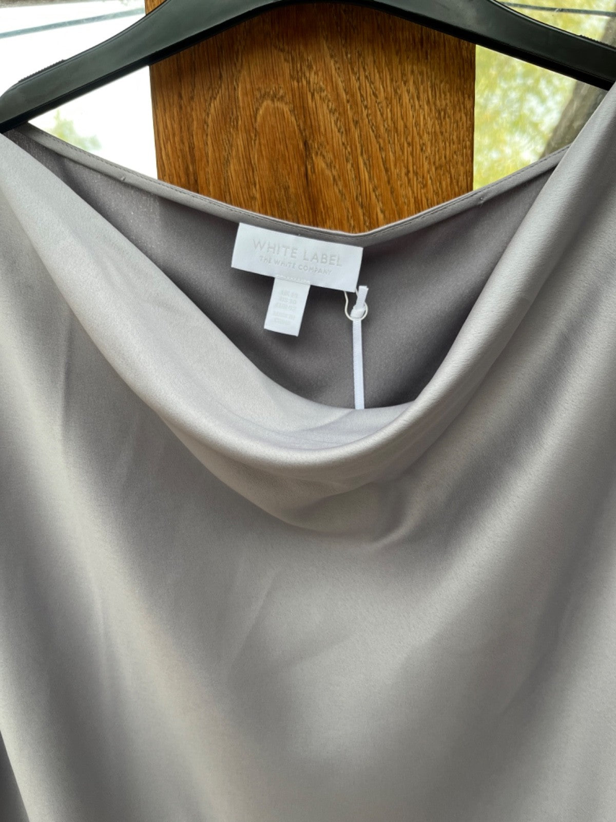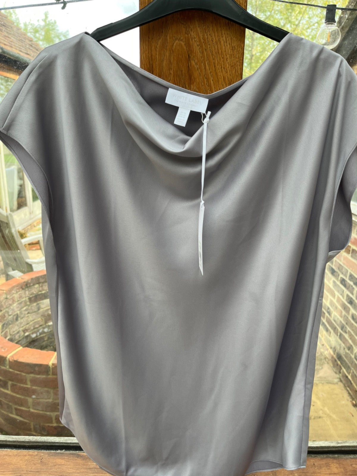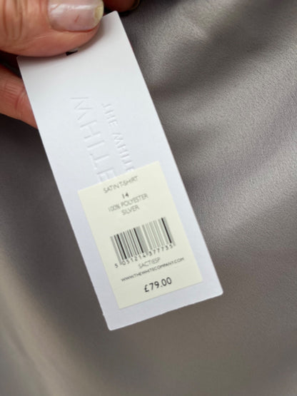 The White Company Silver Satin T-Shirt is a stylish and elegant top designed for women. Made from polyester satin fabric, this solid silver coloured shirt features a cowl neck, short cap sleeves, and a pullover closure. With a regular fit and size 14, it is perfect for everyday wear or special occasions. The brand's reputation for quality and sophistication is evident in this chic and versatile t-shirt.Was £79 New